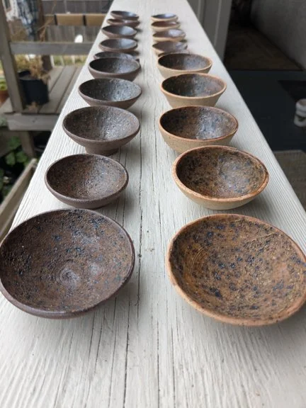 I decided to try a very simple ash glaze, combining the local clay with wood ash, reasoning that the local clay would be similar enough to redart, and with a line blend I could try and figure out a good ratio. I posted on my local buy nothing group to see if anyone had ash in their fireplace or fire pit that I could collect, and someone responded! However I’m pretty sure they weren’t exclusively firing wood in their fireplace… there was definitely remnants of combustible trash and nails, so in retrospect I shouldn’t have had high hopes for this experiment!